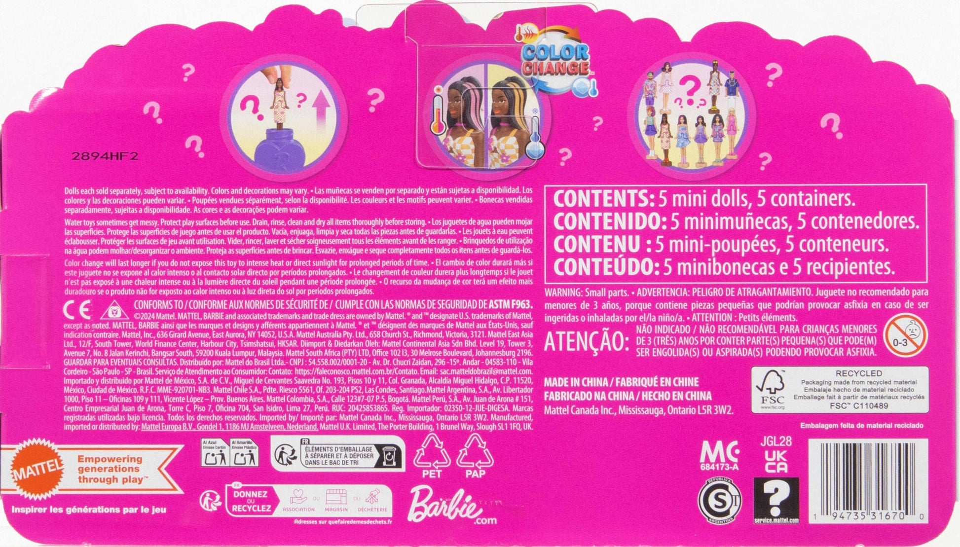 Adéntrate en el mundo de las muñecas Barbie con Mini BarbieLand, ¡un lugar para jugar en miniatura y soñar en grande! Diseñado para sorprender, este set de minimuñecas Fashionistas es perfecto para jugar o exhibir. Los niños y las niñas disfrutarán horas de diversión al encontrar cinco muñecas diferentes, cada una presentada en un empaque con forma de esmalte de uñas. Solo gira el tubo y observa cómo una muñeca Barbie de 1.5 pulgadas aparece como una pequeña sorpresa que les encantará a todos. Cada una puede doblarse por la cintura y se sostiene sobre una base con forma de corazón que es compatible con los sets de juego Mini Barbie Land. A los fans de 4 años en adelante les fascinará esta colección de adorables muñecas para construir su propio mundo en miniatura. Cada uno se vende por separado y está sujeto a disponibilidad. Los colores y las decoraciones pueden variar.