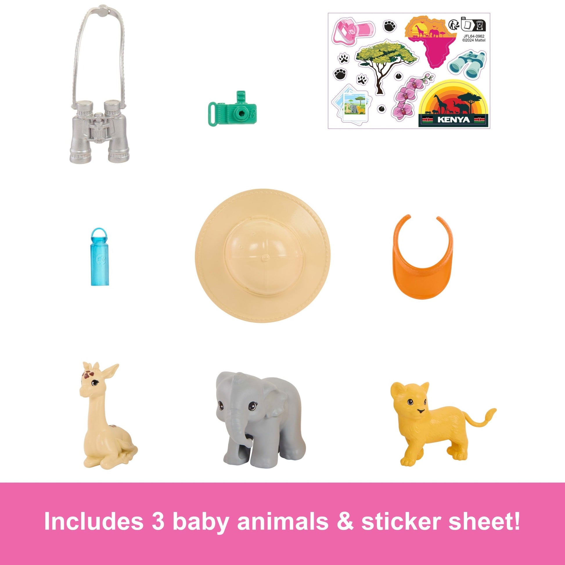 This playset transports kids to Kenya, where they can soar above the sights with Barbie and Ken dolls in their helicopter! The toy helicopter features a colorful pink and yellow exterior, a metallic rotor and landing gear, and space for two dolls to ride -- strap them in and get ready for take-off. The storytelling fun continues with three baby animal friends for the dolls to spot on their journey, plus sight-seeing accessories like a hat, binoculars, camera, sunglasses, and more! Barbie and Ken fashion dolls are ready for adventure in casual outfits and shoes. Young travelers can explore the world with Barbie on all her Pink Passport adventures! Dolls cannot stand alone. Colors and decorations may vary.