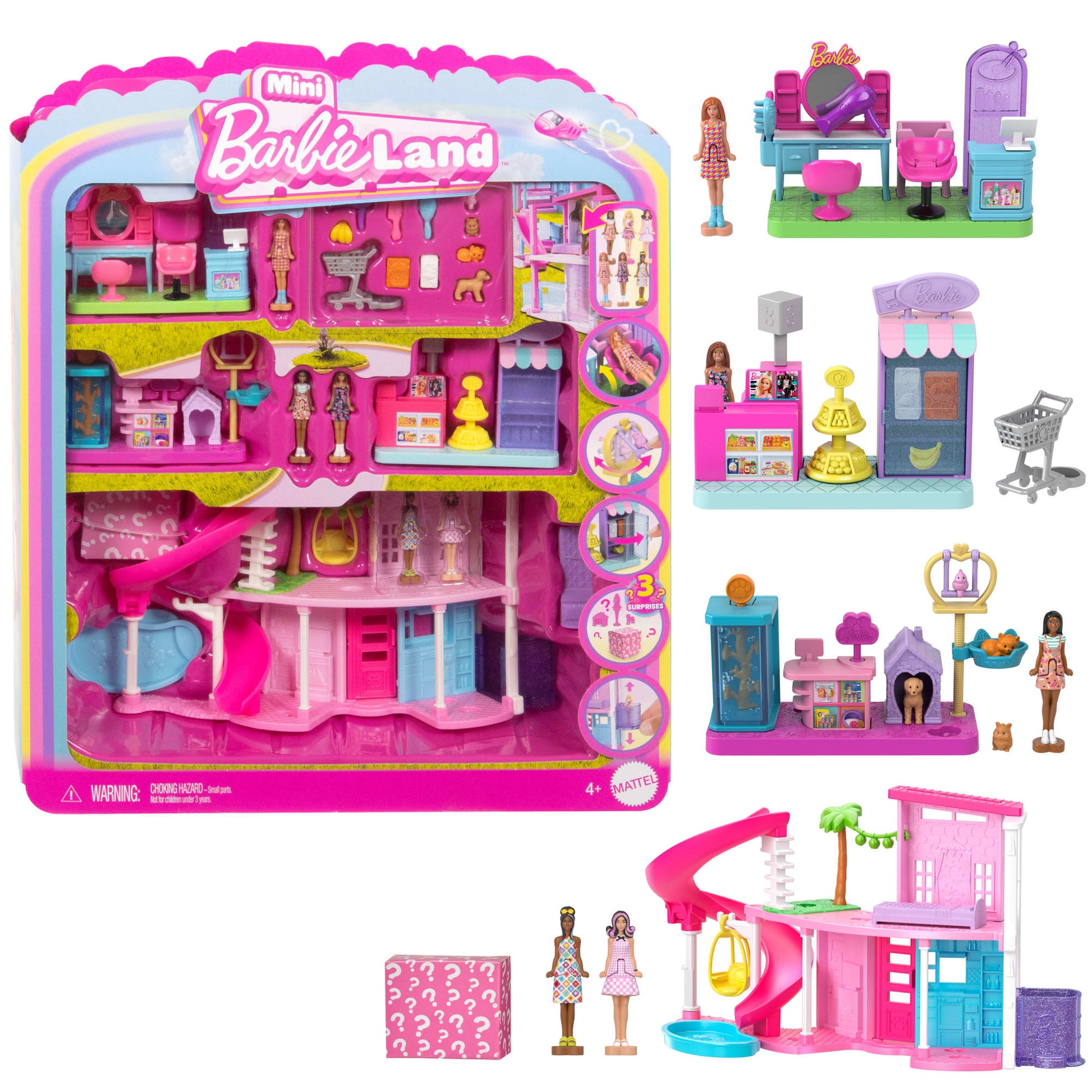 Enter the world of Barbie doll with Mini Barbie Land -- a place to imagine big and Dream in Mini! Built with tiny cuteness and big surprise, this playset includes a mini DreamHouse doll house, three playsets and six mini Barbie dolls ready for play or display. The small-scale DreamHouse comes with unboxing fun that reveals one of the mini Barbie dolls and a randomized pet and pet accessory. A working elevator, slide and pool are just like the fashion doll versions! When it's time for mini adventure, kids can create other storylines with the Pet Boutique, Hair Salon, and Super Market. Each playset comes with a 1.5-inch doll and fun features. The mini dolls bend at the waist and stand on a heart-shaped base that fits into different areas of the house. Fans ages 4 years and older will love the instant Mini Barbie Land collection to build their own mini world! Colors and decorations may vary.