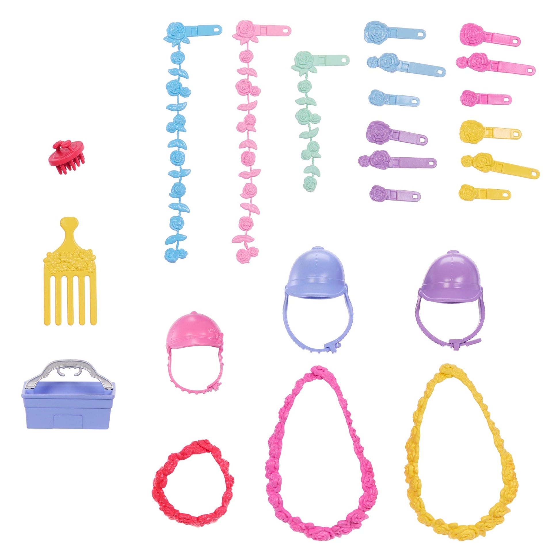 Les jeunes passionnés de chevaux pourront partir à l’aventure avec Barbie et ses amies et laisser galoper leur imagination grâce à ce coffret de jeu il comprend trois poupées, trois chevaux et plus de 20accessoires pour inventer des histoires et créer des styles. Les deux poupées Barbie mode et la petite poupée Chelsea ont toutes les genoux articulés pour pouvoir s’asseoir et monter à cheval comme en vrai. Les deux chevaux et le poney sont chacun équipés d’une selle et d’une bride. Parmi les autres pièces, retrouvez des casques pour les cavalières, des colliers de fleurs pour les chevaux, des accessoires pour les nourrir et les brosser, ainsi que des pinces à cheveux à utiliser sur les poupées ou les chevaux. Les enfants de 3ans et plus adoreront toutes les possibilités de jeu. Les couleurs et les motifs peuvent varier.