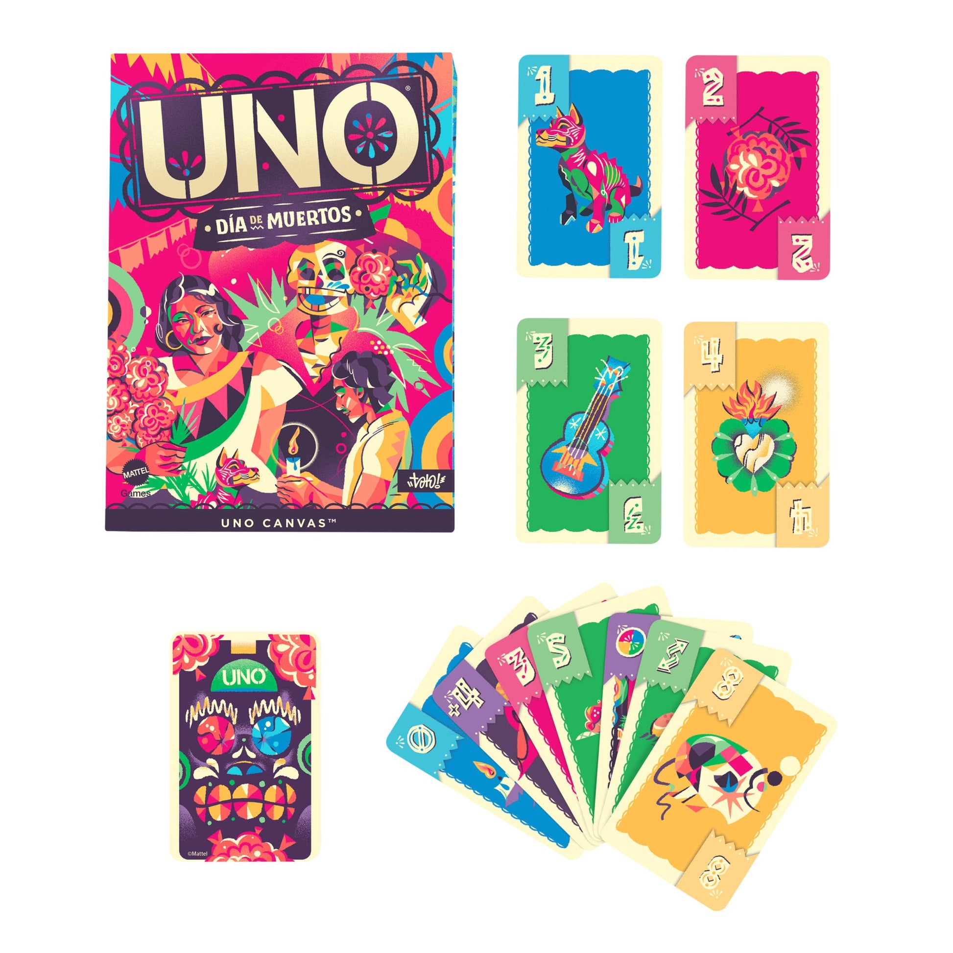 UNO Canvas celebrates the beloved Mexican holiday, Dia De Muertos. Each game card is a tribute to the lively, colorful artwork that has become an iconic part of this festival for the dearly departed, featuring calacas and calaverasskeletons and skulls. The annual party includes food, dancing, and parades as the spirits of the departed return briefly to the living world and are once again united with family and friends to create new memories… perhaps enjoying a game of UNO?