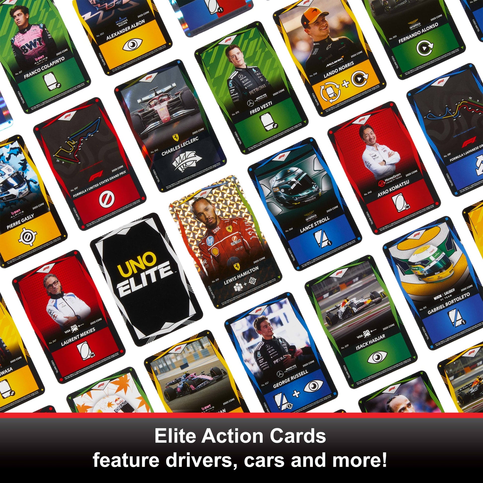 This high-octane UNO Elite Formula 1 card game fuses the strategy of classic UNO with the adrenaline of Formula 1 racing! The excitement starts with a full deck of 112 UNO cards and picks up speed with 40 randomized Formula 1 Elite Action Cards (in four Game Booster Packs) and two Promo Cards. UNO Elite NFL plays like classic UNO, but actions like Skip and Reverse are found on the Elite Action Cards. Each Elite Action Card comes with its own special power that activates when a game player plays a card with an Elite icon on it. And when down to the last card, don't forget to yell "UNO!" The racing-themed game makes a thrilling gift for Formula 1 fans and card game lovers ages 7 years old and up. Colors and decorations may vary.