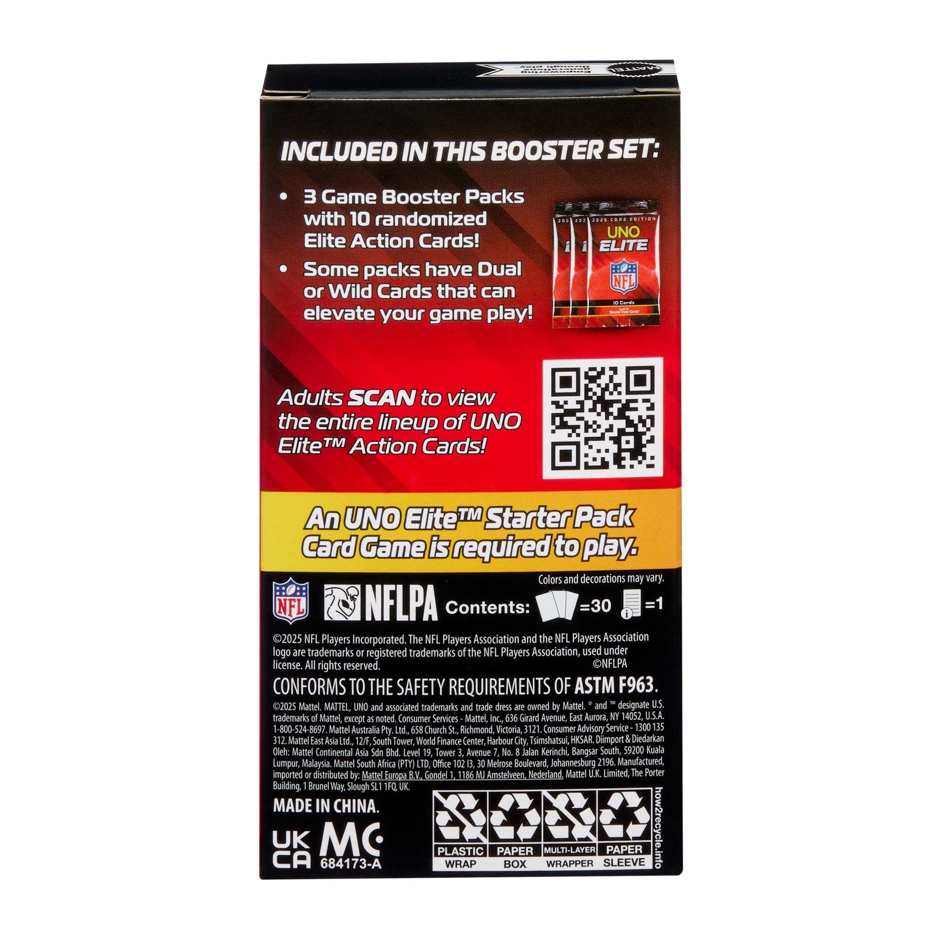 Amplie sua escalação de jogadores da NFL com os kits UNO Elite NFL Booster Sets, oficialmente licenciados! Importante: é necessário ter o Starter Pack, incluso no UNO Elite NFL 2025 – Core Edition (vendido separadamente). Cada kit do UNO Elite NFL Booster vem com 3 pacotes de expansão, contendo 10 cartas de Ação Elite cada, totalizando 30 cartas extras. Quais estrelas da NFL você vai encontrar? São mais de 2.000 cartas de Ação Elite disponíveis para elevar o nível das partidas! Cada carta apresenta um jogador e ativa seu poder especial quando uma carta da mesma cor, com o ícone Elite, é jogada. Alguns pacotes trazem cartas Cor Dupla ou Selvagens. E quando restar só uma carta, grite com tudo: “Hut, hut, UNO!”. É um presente imperdível para fãs de jogos de cartas e da NFL, a partir dos 7 anos de idade. Cada kit é vendido separadamente, sujeito à disponibilidade. Cores e decorações podem variar.