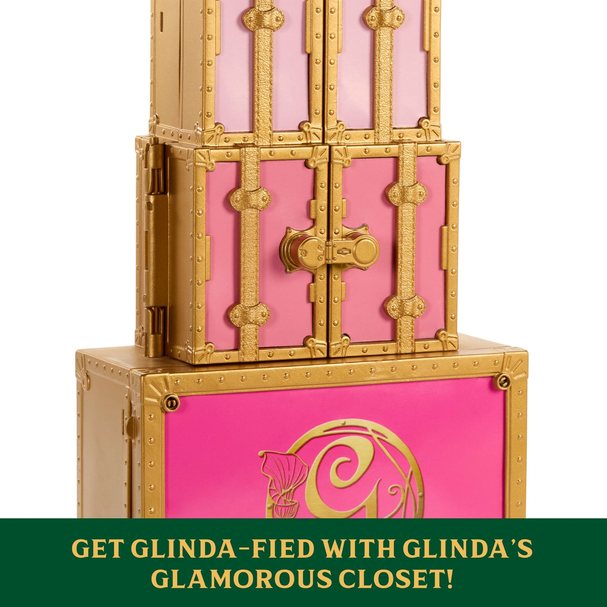 It’s all about the accessories with Universal Pictures’ Wicked Glinda’s Glamorous Closet! Just like in the film, this fold & go closet is made up of 3 connected trunks that open up & out to reveal 2 bewitching fashions & accessories for endless mixing & matching. With surprises like a mirror, doll stand and pop out clothes rack, kids can recreate moments from the magical movie. Doll sold separately. Colors and decorations may vary.